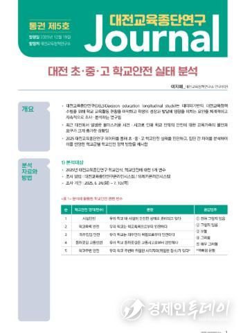경제인투데이 류현민 기자 | 대전교육과학연구원 대전교육정책연구소는 2025년 대전교육종단연구저널 제5호'대전 초·중·고 학교안전 실태 분석', 제6호 '대전 교육가족의 정신건강 현황 분석'을 발간하여 대전 모든 기관 및 전국 교육정책연구소에 안내하고, 대전교육과학연구원 누리집에 공개했다고 밝혔다.