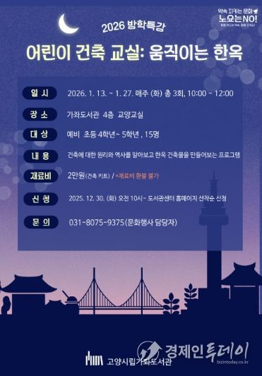 경제인투데이 류현민 기자 | 고양특례시 가좌도서관은 2026년 1월 13일부터 27일까지 매주 화요일 3회차에 걸쳐 방학특강 프로그램 ‘어린이 건축 교실: 움직이는 한옥’을 운영한다고 밝혔다.