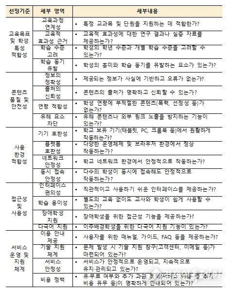 선택기준은 교육목표 적합성과 학교 사용환경 적합성과 같이 학습지원 소프트웨어의 교육적 효과성과 학교 활용 적합성 등을 판단하기 위한 기준으로 구성했다.