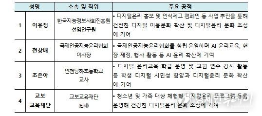 ‘디지털윤리 문화조성 유공’ 표창에는 디지털윤리 교육 및 인식 제고에 기여한 공로로 이유정 한국지능정보원 선임과 전창배 국제인공지능윤리협회 이사장, 조은아 인천당하초등학교 교사, 교보교육재단(단체)이 선정됐다.