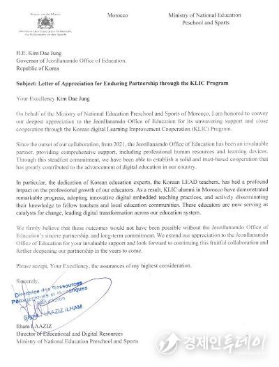 이번 감사 서한은 전라남도교육청이 2021년부터 교육 정보화 지원 사업 (KLIC‧Korean Digital-Learning Improvement Cooperation)을 통해 모로코 교육부와 디지털 교육 분야에서 지속적인 협력을 이어온 데 대한 평가를 담고 있다.