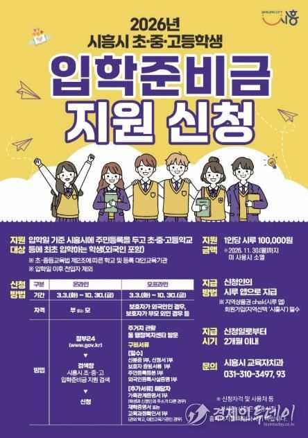 경제인투데이 류현민 기자 | 시흥시는 올해부터 관내 초중고 입학 자녀 가정에 입학준비금을 10만 원씩 지원한다. 이번 지원은 도서나 문구류 등을 새로 마련해야 하는 신입생 가정의 경제적 부담을 줄여주고, 교육 기본권을 강화하고자 추진됐다.