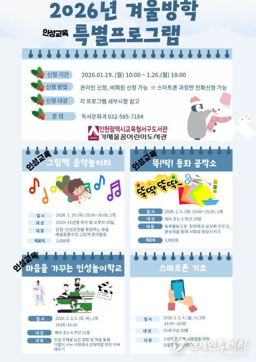 경제인투데이 류현민 기자 | 인천광역시교육청서구도서관은 ‘2026년 겨울방학 특별프로그램’ 학습자를 19일 오전 10시부터 선착순으로 모집한다.