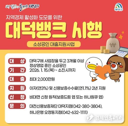 경제인투데이 류현민 기자 | 대전 대덕구는 경기침체로 자금 운용에 어려움을 겪는 지역 소상공인의 금융 부담을 완화하기 위해 소상공인 대출지원사업 ‘2026 대덕뱅크’를 시행한다.