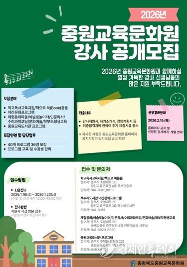 경제인투데이 류현민 기자 | 충청북도교육청 직속기관 중원교육문화원은 23일까지 학생과 학부모, 지역주민을 대상으로 운영하는 2026년도 인문독서 및 문화예술 프로그램 강사를 공개 모집한다고 밝혔다.