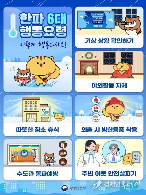 가용매체를 총동원하여 기상 정보 확인, 외출 자제, 외출 시 목도리 착용, 수도관 동파 예방조치 등 한파 대비 국민행동요령을 전파한다.