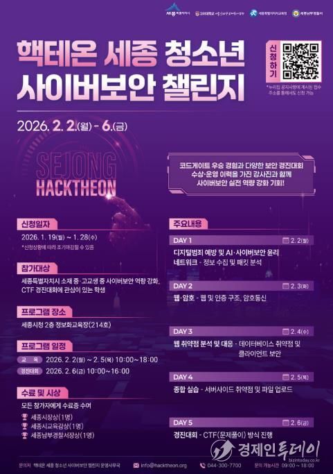 세종특별자치시는 오는 28일까지 관내 중고등학생을 대상으로 핵테온 세종 청소년 사이버보안 챌린지 참가자를 모집한다고 밝혔다.