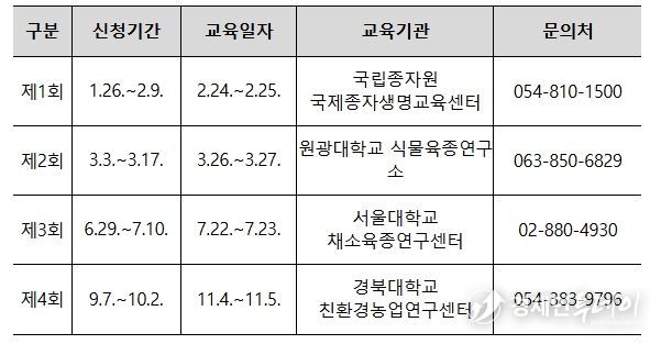 교육운영 방식은 전년도 교육 수료자들의 의견을 반영하여 집합(24일)과 온라인교육(25일)을 병행하여 운영되며 교육 신청자는 관련 세부 사항 및 일정(교육신청: 1.26~2.9)을 국제종자생명교육센터 누리집에서 확인할 수 있다.