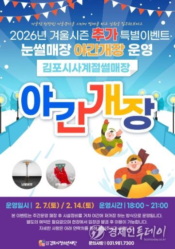 경제인투데이 류현민 기자 | 김포시는 겨울철 야간 여가문화 확대와 시민 만족도 제고를 위해 2026년 겨울시즌 야간개장 프로그램 ‘눈 내리는 은빛 썰매장’을 운영한다고 밝혔다.