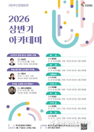경제인투데이 류현민 기자 | (재)부산문화회관은 오는 3월 9일부터 7월 1일까지 2026년도 상반기 정규 아카데미 강좌를 개설한다.