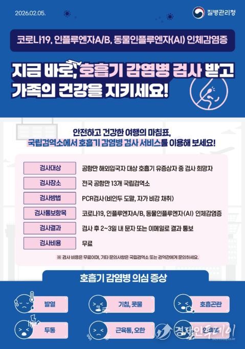 경제인투데이 류현민 기자 | 질병관리청은 2026년 2월 10일부터 '여행자 호흡기 감염병 검사 서비스'를 전국 공항·항만 13개 검역소(12개 지소)로 확대하여 시행한다.