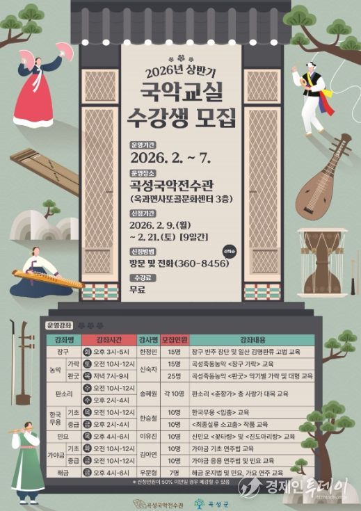 경제인투데이 류현민 기자 | 전남 곡성군은 곡성국악전수관에서 운영하는‘2026년 상반기 국악교실’수강생을 모집한다고 6일 밝혔다.