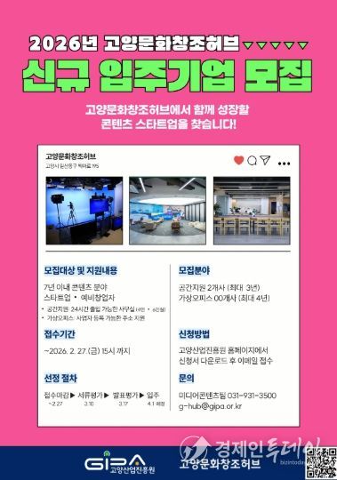 신청은 고양문화창조허브 전자우편으로 가능하며, 평가를 거쳐 3월 중 최종 기업을 선정해 4월부터 입주할 예정이다.