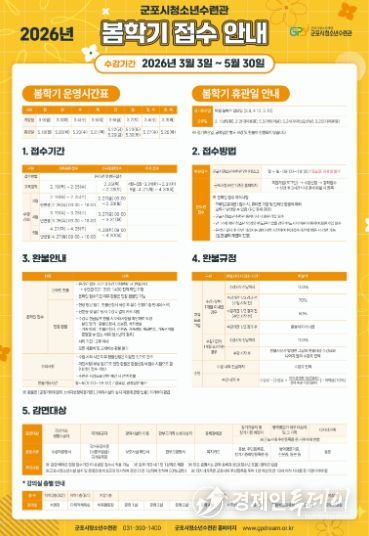 경제인투데이 류현민 기자 | (재)군포시청소년재단 군포시청소년수련관은 오는 2026년 3월 3일부터 5월 30일까지 ‘2026년 봄학기 문화체육 프로그램’을 운영하며, 2월 26일부터 신규 수강생 접수를 시작한다.