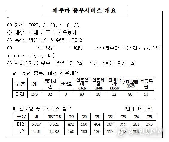 서비스는 평일에는 오전·오후 각 1회, 주말 및 공휴일에도 오전 1회 제공된다. 농가 편의를 위해 전담직원을 배치하고 제주마의 발정 시기에 맞춰 운영한다.
