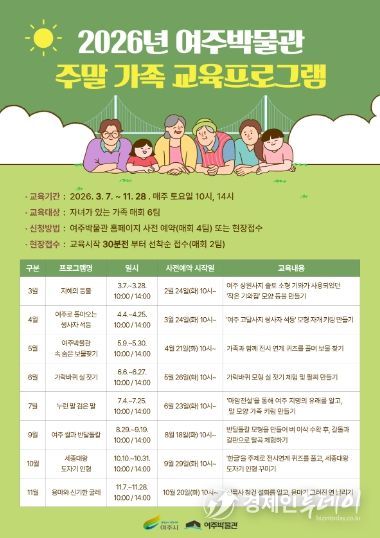 경제인투데이 류현민 기자 | 여주시 여주박물관은 오는 3월 7일부터 11월 28일까지 매주 토요일, 가족 단위 관람객을 대상으로 한 ‘2026년 주말 가족 대상 교육프로그램’을 운영한다.