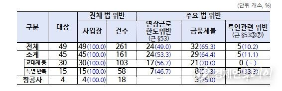 감독 결과, 4개소 전 사업장에서 총 18건의 법 위반 사항이 적발됐다. 주요 위반 내용으로는 ▴브리핑 시간 등을 제외하고 순수 비행시간만 근로시간으로 인정하는 등 야간근로수당 미지급 3개소(75.0%, 약 7억원), ▴기간제 승무원을 차별하여 비행수당 미지급 1개소(25.0%, 약 5억 5천만원), ▴산후 1년 미경과자 시간외 근로 한도 초과 2개소(50.0%) 등이 확인됐다.