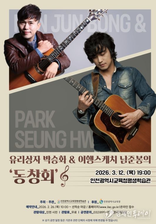 경제인투데이 류현민 기자 | 인천광역시교육청평생학습관은 시민의 다양한 문화예술 향유를 위하여, 3월 12일 교육누리홀에서 ‘유리상자 박승화 & 여행스케치 남준봉’ 음악 공연을 개최한다.