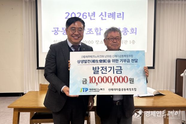 경제인투데이 류현민 기자 | 신례리공동목장조합(조합장 양춘식)과 20년 넘게 상생협력을 이어오고 있는 제주테크노파크(원장 지영흔, 제주TP)가 발전기금을 쾌척했다.