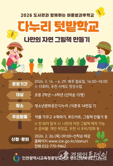 경제인투데이 류현민 기자 | 인천광역시교육청중앙도서관 청소년문화공간 다누리는 26일부터‘다누리 텃밭학교: 씨앗에서 그림책까지’ 참여자를 모집한다.