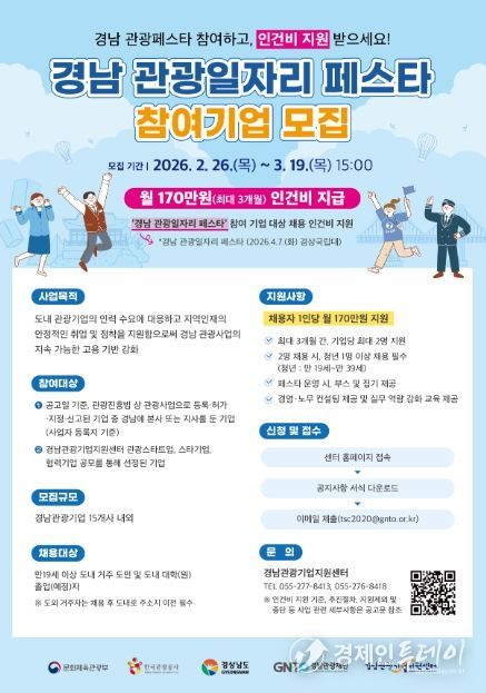 경제인투데이 류현민 기자 | 경상남도는 경남관광재단 관광기업지원센터 주관으로 도내 관광기업의 인력 수요에 대응하고 지역인재 취업을 지원하기 위해 ‘2026 경남 관광일자리 페스타’ 참여기업을 모집한다고 밝혔다.