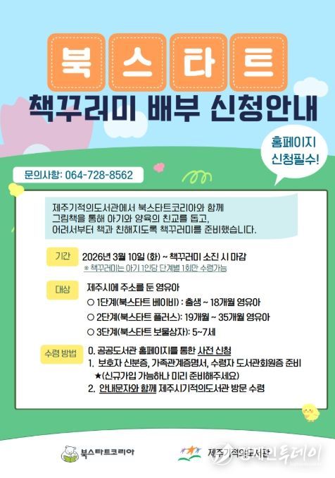 경제인투데이 류현민 기자 | 제주기적의도서관은 영유아의 평생 독서 습관 형성을 위해 북스타트 사업 ‘내 생애 첫 선물, 책꾸러미’ 배부 대상을 확대한다.