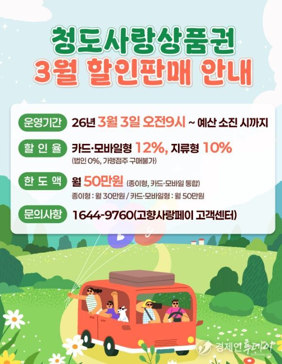 청도군은 예산 범위 내에서 할인 혜택을 적용할 예정이며, 월 구매 한도(월 50만원, 단 지류형 30만원) 등 세부 사항은 기존과 동일하게 운영한다.