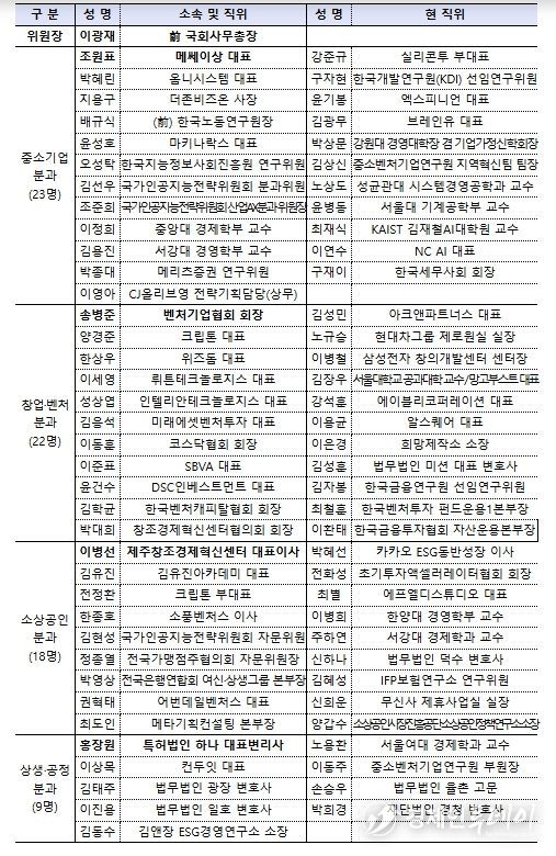 민관 정책협의회는 기업인, 민간 전문가, 학계, VC, 협·단체 등 총 72명의 위원으로 구성되어 출범일로부터 1년간 활동하게 된다. 또한 한성숙 중기부 장관과 이광재 전 국회사무총장이 공동위원장을 맡아 민관 정책협의회를 이끌어갈 예정이다.