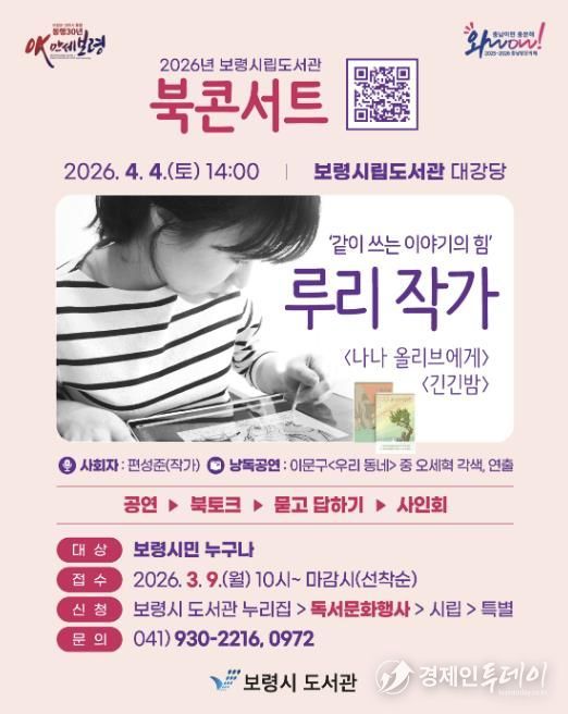 경제인투데이 류현민 기자 | 보령시는 4월 4일 토요일 오후 2시 보령시립도서관 대강당에서 베스트셀러 『긴긴밤』의 저자 루리 작가를 초청해 북콘서트를 개최한다고 밝혔다.