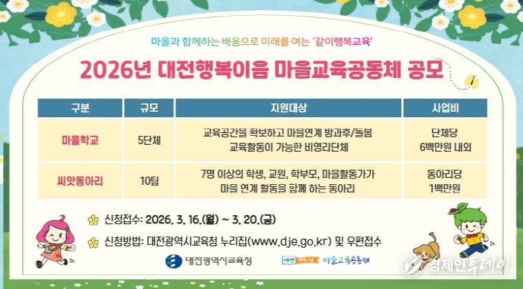 경제인투데이 류현민 기자 | 대전시교육청은 마을과 학교가 협력하는 교육생태계 조성을 위해 ‘2026년 마을교육공동체 마을학교 및 씨앗동아리’를 공모한다고 밝혔다.
