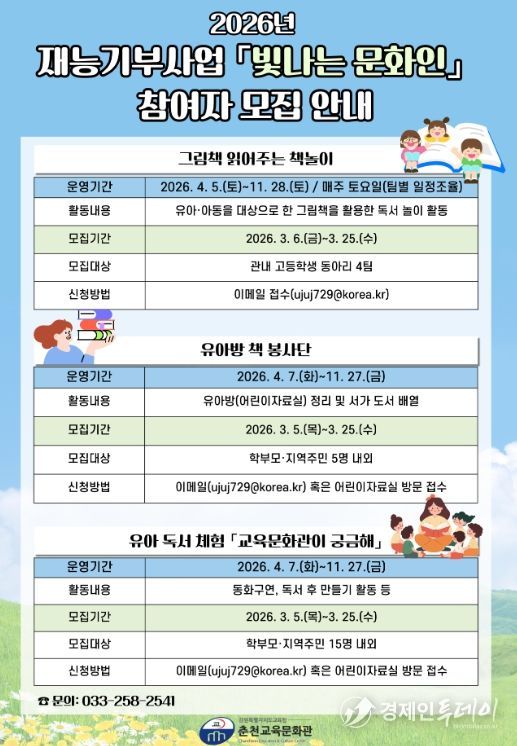 경제인투데이 류현민 기자 | 춘천교육문화관은 4월부터 11월까지 지역 청소년과 주민을 대상으로 재능기부사업 '빛나는 문화인'을 운영한다.