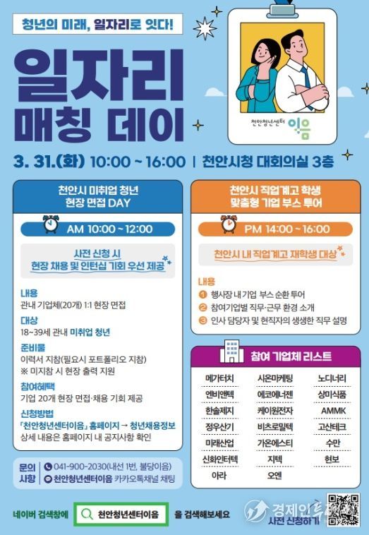 경제인투데이 류현민 기자 | 천안시가 ‘2026년 청년 일자리 매칭데이’ 참여자를 모집한다고 11일 밝혔다.