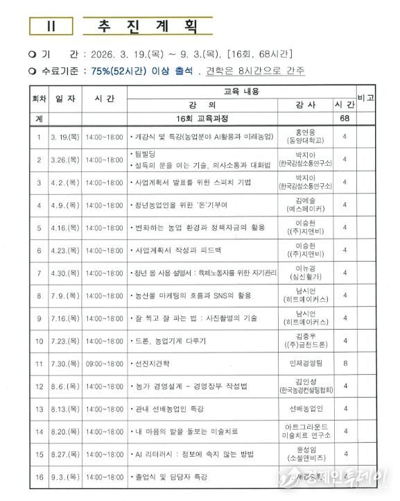 이번 청년농업인과정은 3월 19일 개강식을 시작으로 9월 3일까지 총 16회에 걸쳐 운영될예정이며 특히 변화하는 농업 환경에 발맞추어 청년농업인들이 현장에서 필요로 하는실질적인 지식과 기술을 전달하고 농촌의 안정적인 정착을 도모할 수 있는 다양한프로그램이 마련되어 기대를 모으고 있다.