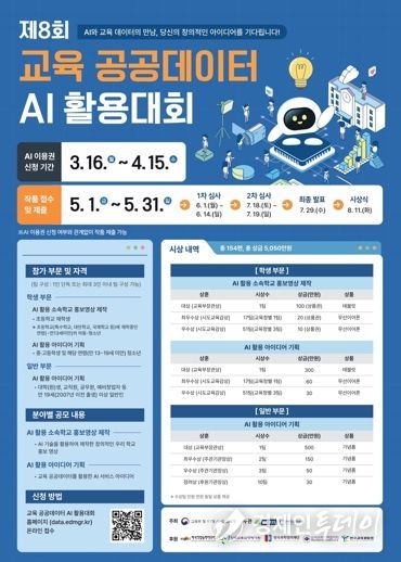 AI 활용 아이디어 기획 부문은 중‧고등학교 재학생 및 만19세 이상 일반인이 참여할 수 있으며 교육 공공데이터를 활용해 학교생활, 학습, 안전 등 교육 현장의 문제를 해결할 수 있는 AI 기반 서비스나 아이디어를 제안하면 된다.