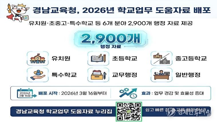 경제인투데이 류현민 기자 | 경상남도교육청은 학교 현장의 행정 부담을 줄이고 교직원의 업무 편의성을 높이기 위해 오는 16일 이후 ‘2026년 학교업무 도움자료’를 보급한다.