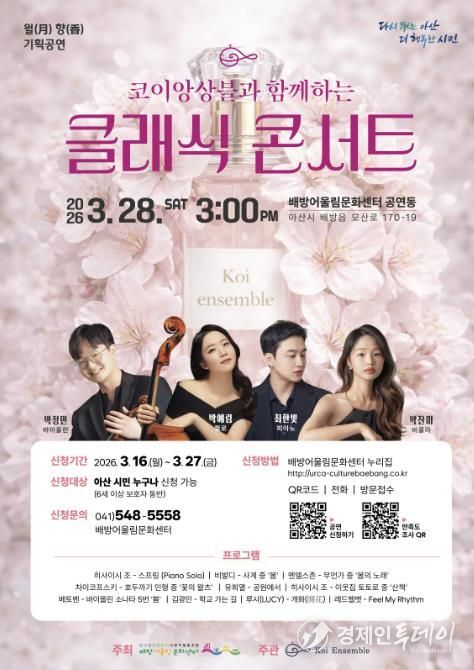 경제인투데이 류현민 기자 | 아산시 배방어울림문화센터는 오는 3월 28일 오후 3시, 공연동에서 청년 음악가들로 구성된 ‘코이앙상블’의 클래식 콘서트를 개최한다고 밝혔다.