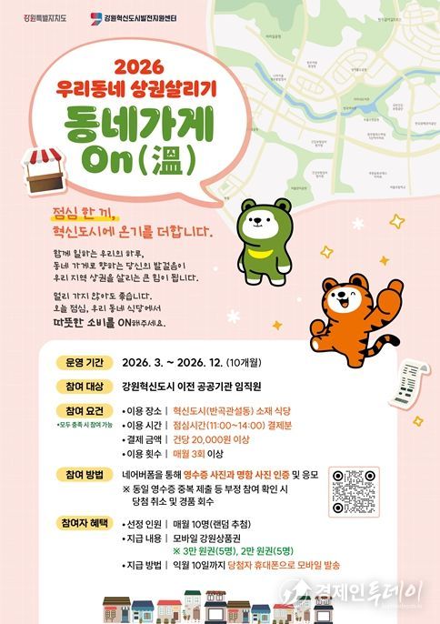 경제인투데이 류현민 기자 | (재)강원혁신도시발전지원센터에서는 강원혁신도시 이전 공공기관 임직원을 대상으로 지역 상권 활성화를 위한 ‘2026 우리동네 상권살리기 동네가게 On(溫)’사업을 추진한다고 밝혔다.