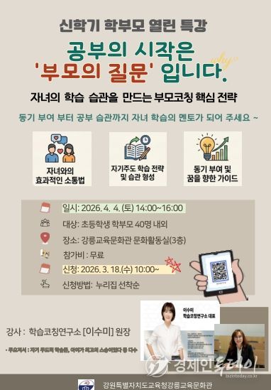 경제인투데이 류현민 기자 | 강릉교육문화관은 오는 4월 4일 오후 2시 초등학교 학부모를 대상으로 ‘학부모 열린 특강’을 운영한다.