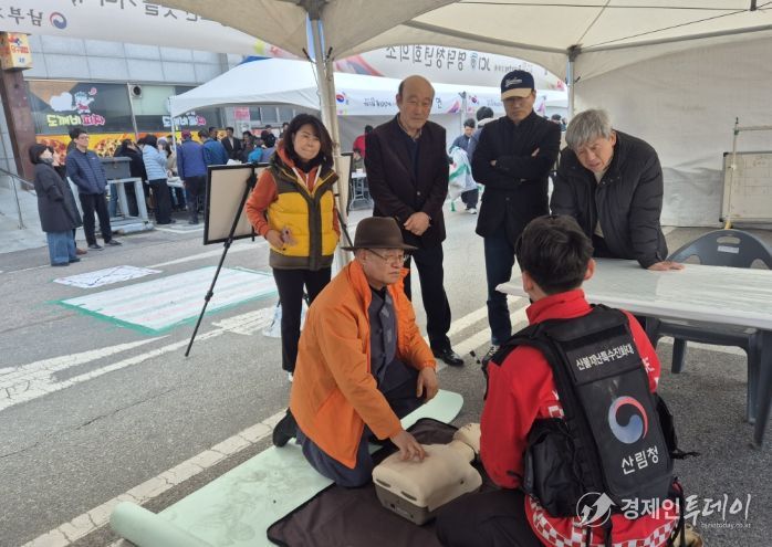 응급처치(심폐소생술) 교육: 산림재난대응팀 직원들이 심폐소생술 동작을 시범보이고, 방문객이 직접 실습에 참여할 수 있도록 실습형 교육을 진행했다.