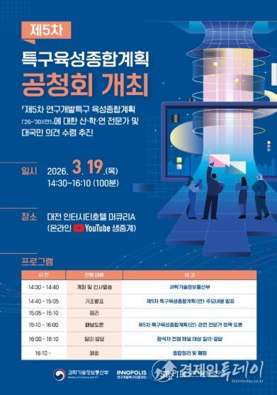 경제인투데이 류현민 기자 | 과학기술정보통신부는 2026년 3월 19일 14시 30분, 대전에서(인터시티호텔, 머큐리 A홀) 제5차 연구개발특구육성 종합계획 공청회를 개최한다.