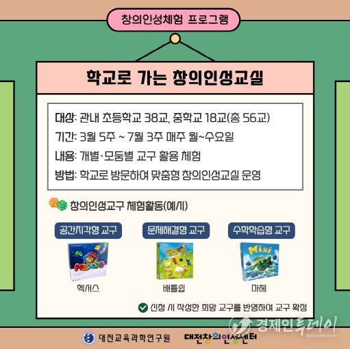 경제인투데이 류현민 기자 | 대전교육과학연구원 창의인성센터는 2026학년도 3월 30일부터 매주 월·화·수요일 관내 초·중학교 학생들을 대상으로 ‘학교로 가는 창의인성교실’을 운영한다고 밝혔다.