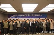 경제인투데이 류현민 기자 | 광주광역시는 16일 라마다플라자 광주호텔에서 한국전자기술연구원, 광주미래차모빌리티진흥원과 함께 ‘미래차 AIDX 혁신 협의체 출범식’을 열었다. 출범식에는 광주시, 광주과학기술원, 한국전자기술연구원, 한국광기술원, 광주미래차모빌리티진흥원, 국방기술진흥연구원, 한국생산기술연구원, 조양정밀공업㈜, 코비코㈜, DH오토웨어㈜, 한국알프스㈜, ㈔인공지능산학연협회 등에서 협의체 위원과 업계 관계자 30여 명이 참석했다. 협의체는 자동차 산업이 급속하게 인공지능(AI) 기반으로 전환함에 따라 산·학·연·관 전문가들과 함께 지역 미래차 산업의 대응 방안을 모색하기 위해 출범했다. 협의체는 인공지능 기반 자동차(AIDV)·공장(AIDF)·국방자동차(M.AIDV) 등 3개 분과로 구성, 각 분야 대응방안을 논의하기로 했다. 이날 1차 회의에서 협의체 구성원들은 인공지능 기술을 자동차 제조공정에 적용하기 위한 ‘피지컬 AI 기반 제조혁신공장 실증 지원’을 2027년 신규 국비 과제로 제안했다. 이날 출범식에서는 정구민 국민대학교 교수가 ‘글로벌 인공지능 기반 자동차(AIDV)